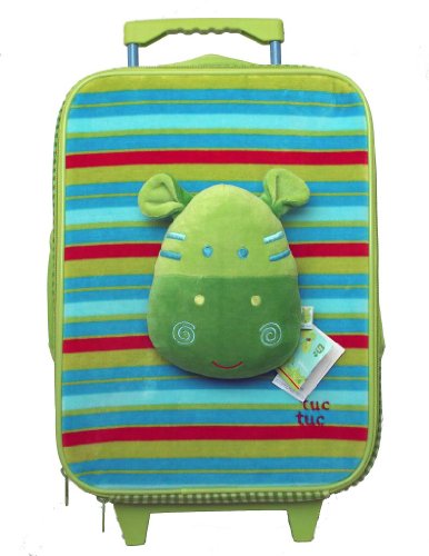 The cutest rolling children's suitcase ever! Cute hippo on the front, two side pockets, zipper opening, interior zippered mesh pocket and hold down strap. Well made, with telescoping handle. High-quality cotton velour fabric exterior and nylon lined interior. Take it away for the weekend or to grandma's overnight! Especially designed for small children, very light, height appropriate for up to 7 years of age. Measures 11.4" x17.3" x 5.9". Imported from Europe. Made by Tuc Tuc.Customer Reviews